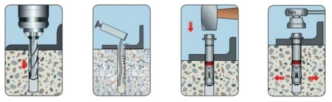 Распорные анкеры крепятся по стандартной схеме. На рабочей поверхности размечаются места фиксации болтов, в них сверлятся отверстия нужного диаметра. Проемы очищаются от пыли и мусора, происходит установка метизов. Болты протягиваются гаечным ключом, при необходимости используется рычаг.